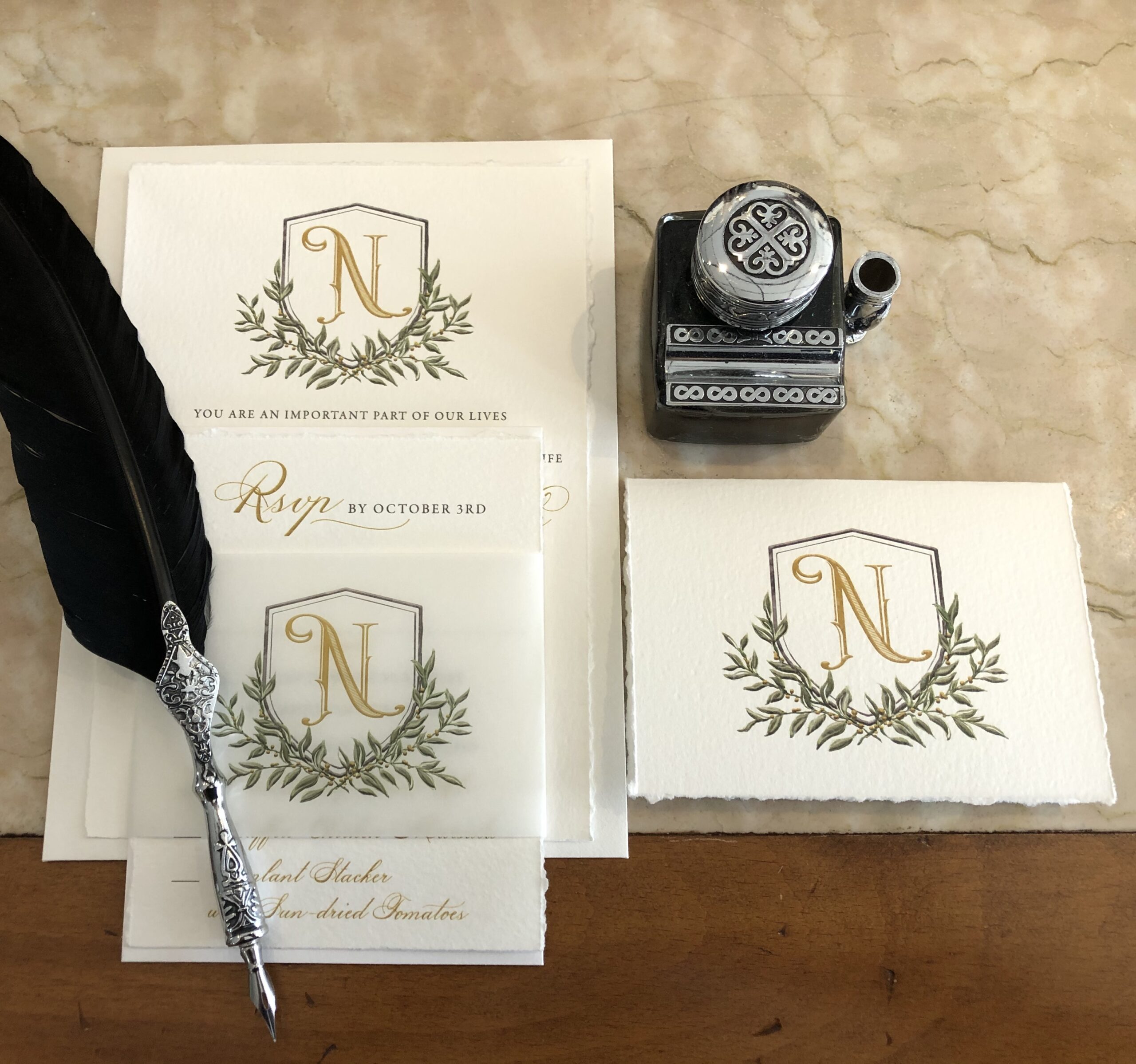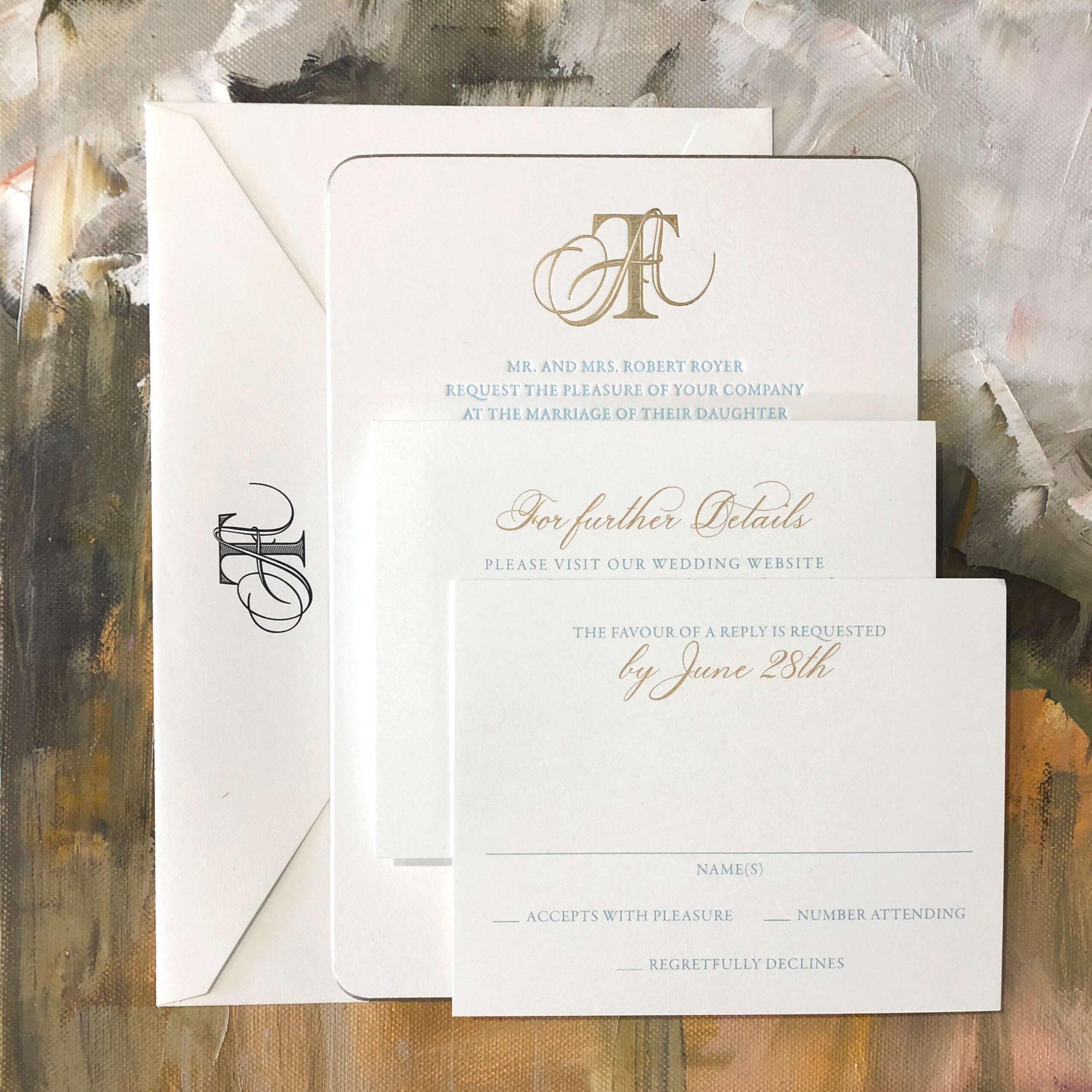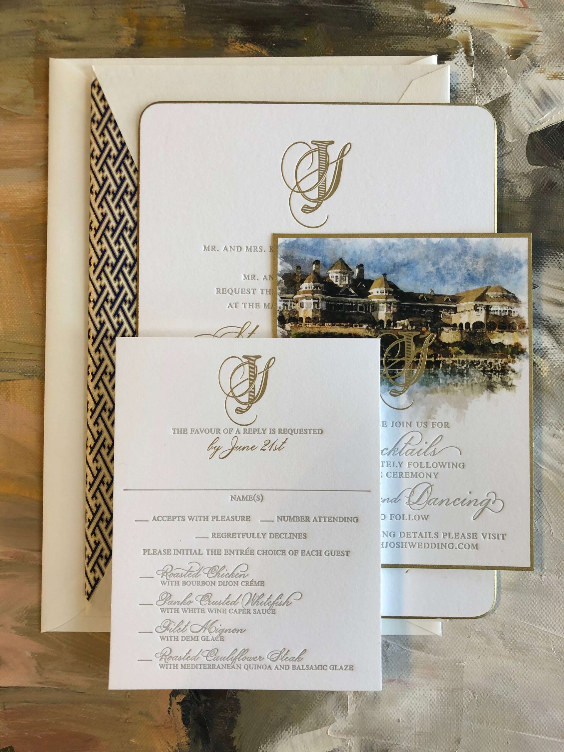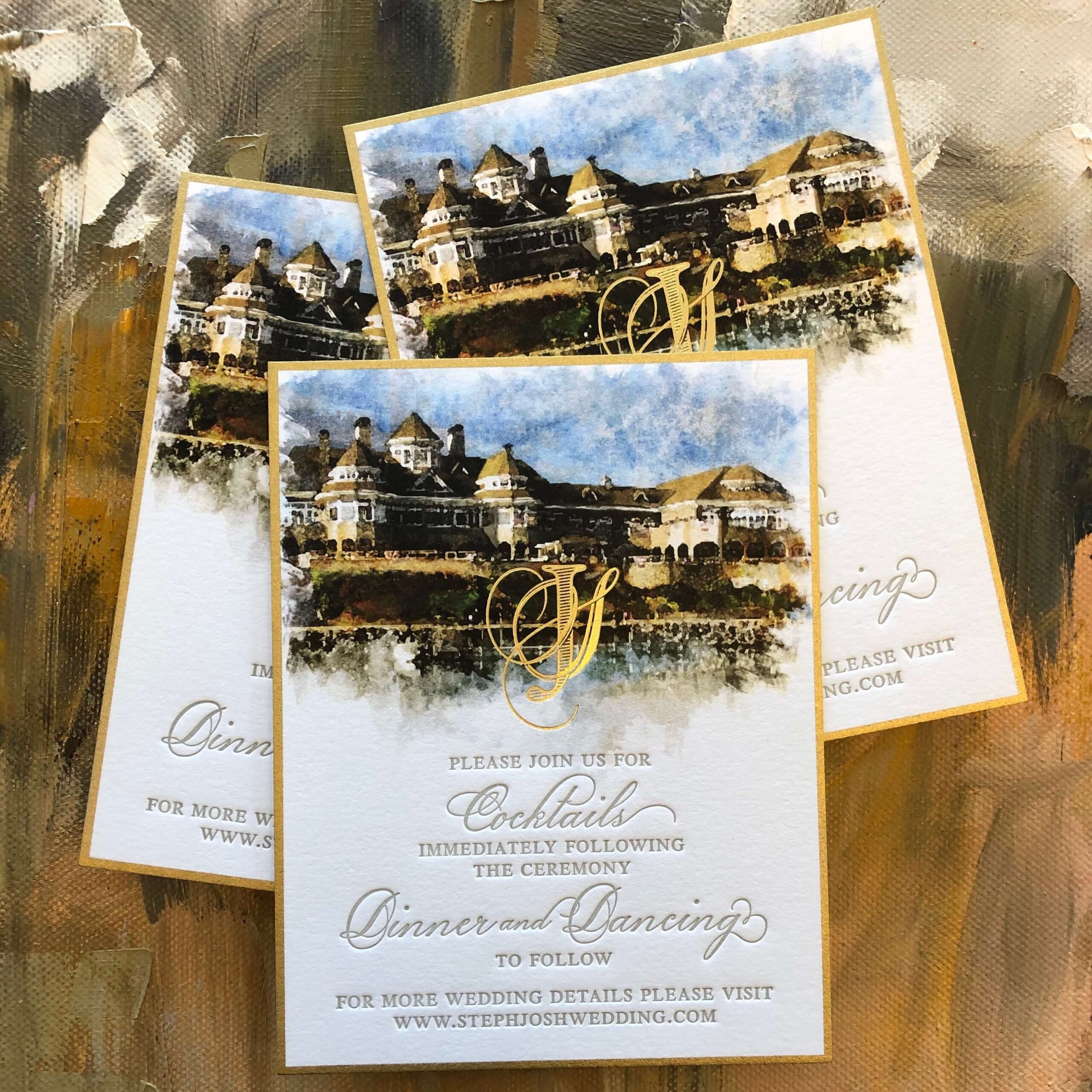 In this section we present a small sampling of our latest work. Our mission as Printers and Stationers at Maria Gossard Designs is finding unique ways to Celebrate you as you prepare to announce your wonderful news. In our very own print shop we utilize modern technology with Old World craftsmanship where we design and craft paper into something beautiful with enduring results. We offer letterpress, off-set and digital printing, foil stamping, engraving, thermography, die cuts, custom monograms, watercolors, hand finished borders and so much more. Whether your style is Classic, Timeless Elegance, Modern and Sophisticated, Bohemian Chic, Playful or Whimsical with Watercolor Details, Rustic, Vintage, Minimalist or a Glamorous Black-Tie Affair we are able to create something perfect just for you. You never get a second chance when announcing your wedding plans. Allow us to help you do so beautifully.